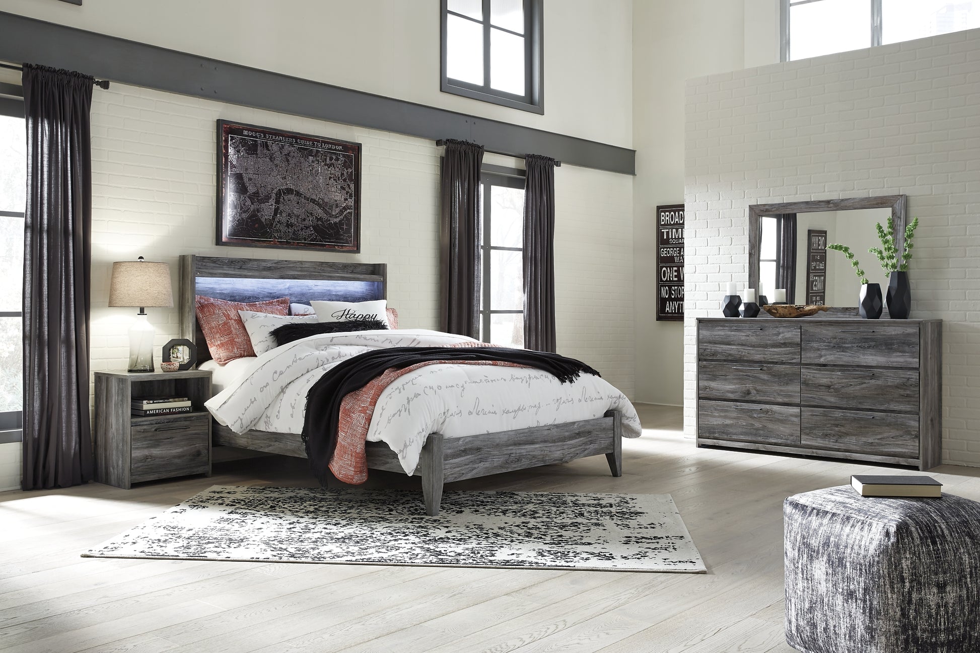| Details | B221B2: Includes headboard, footboard and rails, Made with engineered wood (MDF/particleboard) and decorative laminate, Smoky gray finish over replicated oak grain with authentic touch, Foundation/box spring required, sold separately, Mattress available, sold separately, Assembly required, Bed is compatible with an adjustable base, B221B30: Includes dresser and mirror, Made with engineered wood (MDF/particleboard) and decorative laminate, Smoky gray finish over replicated oak grain with authentic touch, 6 smooth-gliding drawers, Linear pulls with antiqued gunmetal-tone finish, Faux linen finished drawer interiors, Mirror attaches to back of dresser; can also hang vertically or horizontally on wall, Safety is a top priority, clothing storage units are designed to meet the most current standard for stability, ASTM F 2057 (ASTM International), Drawers extend out to accommodate maximum access to drawer interior while maintaining safety, Assembly required, B221-91: Made of engineered wood (MDF/particleboard) and decorative laminate, Smoky gray finish over replicated oak grain, Linear pull with antiqued gunmetal finish, 1 smooth-gliding drawer and open cubby, Faux linen finished drawer interior, Slim-profile USB charging station, Power cord included; UL Listed, Small Space Solution, Assembly required, | |